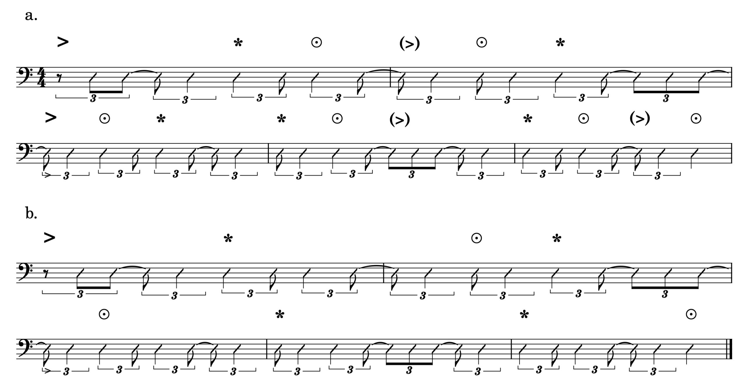 Figure 10: Entrainment of the “Pendulum” ostinato involving the accent patterns of both meter and timeline rhythms. Accents indicate metrically strong beats, and accents in parenthesis highlight strong beats weakened by the ostinato’s off-beat placement. Star symbols indicate metrically strong beats that coincide with timeline accents, and bullseye symbols indicate metrically weak beats that coincide with timeline accents.