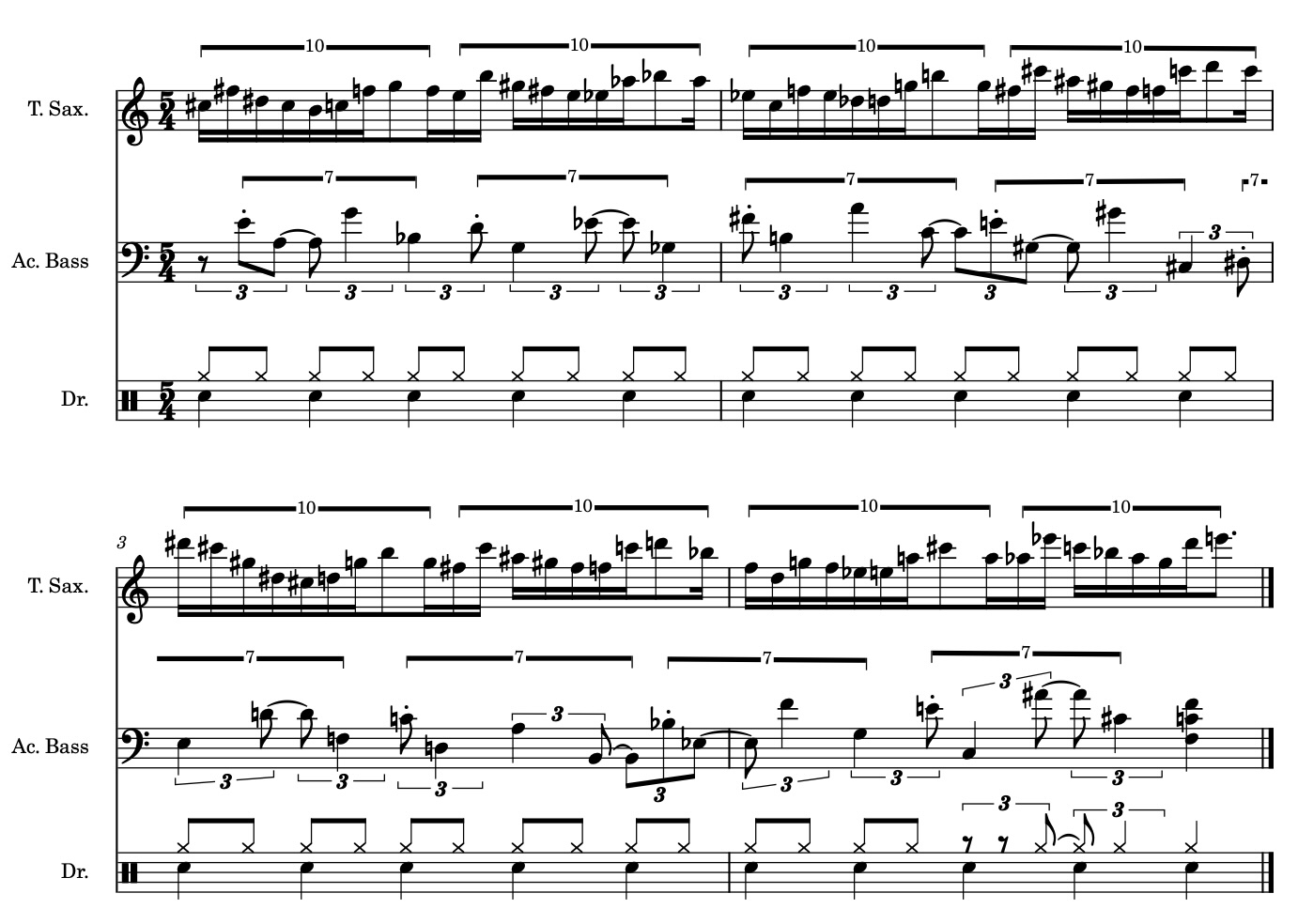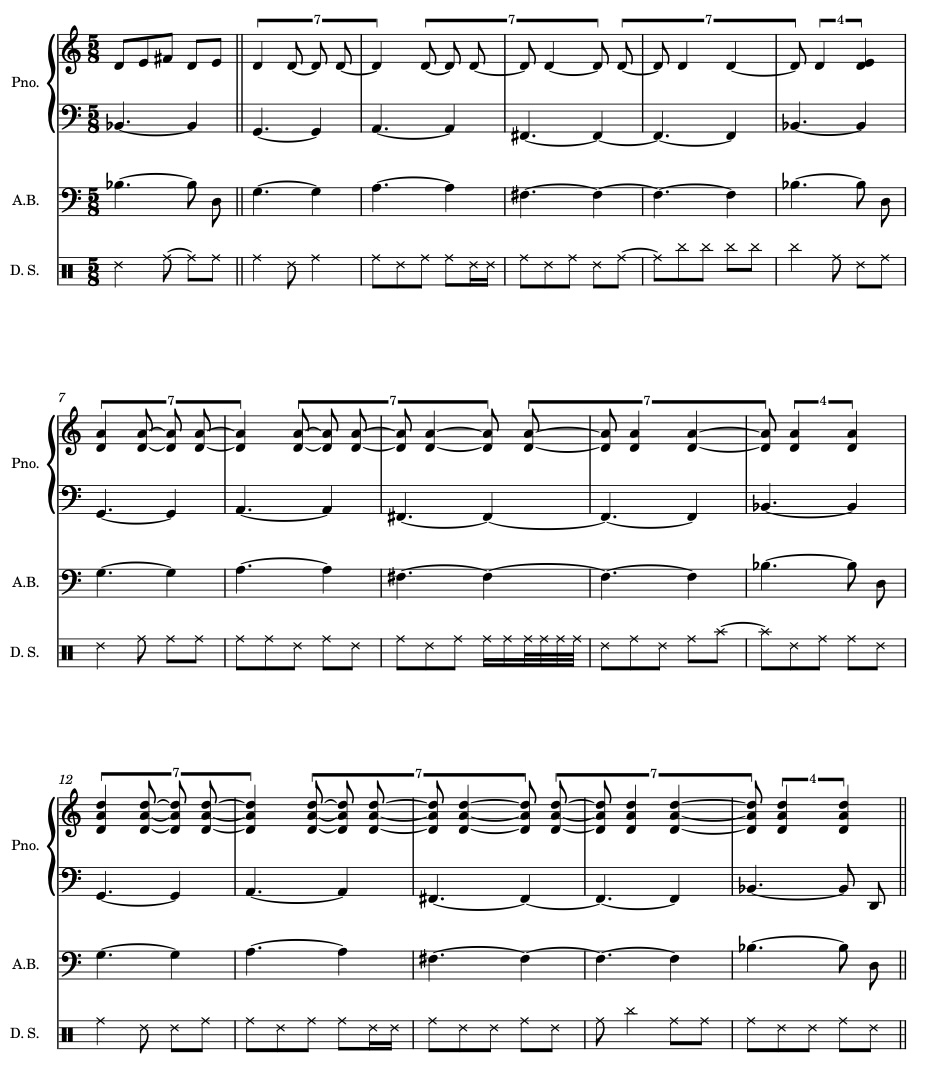 A dynamic and flexible approach to meter in improvised music not only involves co-pulses and co-meters with constitutive hierarchies, but also rhythms as distinct entities capable of serving the structural role of meter. Figure 8 and Media 8 present an excerpt of Patrick Zimmerli’s “Pendulum.”25See Zimmerli (2018) for complete audio track, available through this link. The B section has a triplet ostinato played by the bass and piano.26I’ve omitted the piano in the figure for ease of reading. This figure can be segmented in groups of seven eighth-note triplets to form a non-isochronous 1 + 2 + 2 + 2 rhythm, a variant of the common 2 + 2 + 3. This grouping scheme creates a cycle of eight groupings of seven with an extra quarter note at the end. To further complicate metric interpretations, the starting point of the ostinato is uncertain. The first onset can be felt in three different ways: 1) as a potential downbeat, 2) as a syncopated after-beat accent where the first rest is the downbeat, and 3) as an anacrusis to the third eighth-note triplet, another potential downbeat. The melody uses a sixteenth-note subdivision that segments phrases in groups of ten due to the parallel melodic and rhythmic structure. The initial phrase follows a 2 + 3 + 2 + 3 grouping from C#5 to F5, which becomes clear in the saxophone’s articulation. As a result of these varying subdivision levels, there are multiple pulse streams generating grouping dissonances against the steady quarter note pulse. To complicate matters even further, Zimmerli cheekily remarked that “by the way […] Pendulum is in 4/4.” Because the melody is grouped in fives, it would be much more challenging to sight-read the music if written in 4/4, as the five groupings neatly fit inside the five-beat measures. While the notated meter provides a simpler shorthand for reading the music, it does not necessarily serve as the only organizational scheme for performing and improvising.