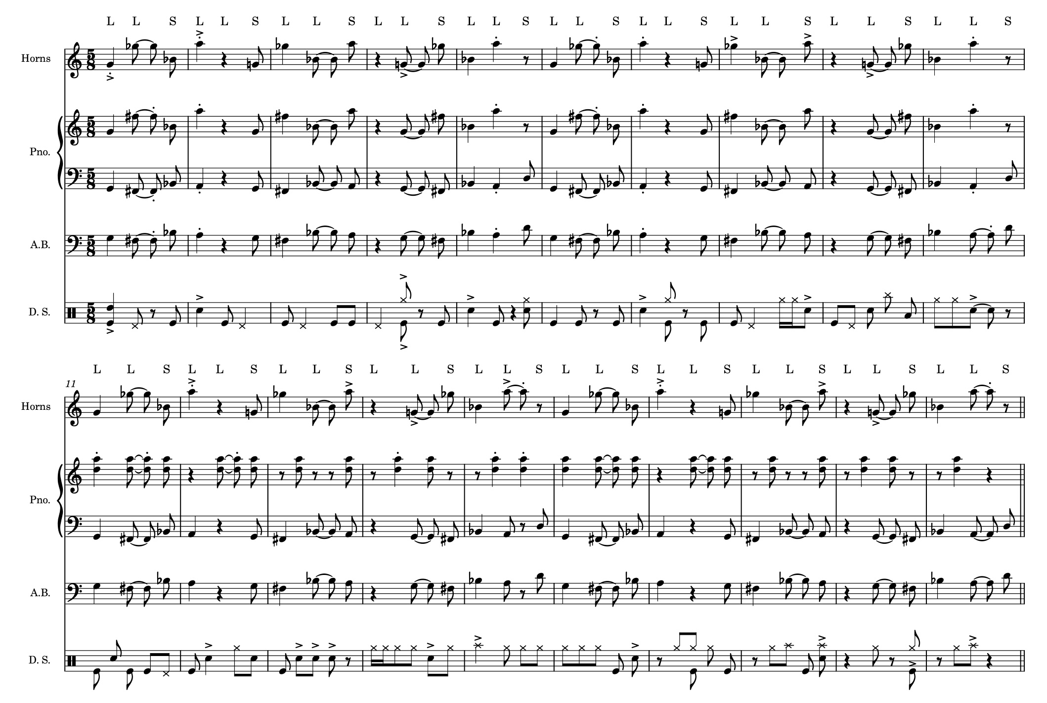 Figure 13: Excerpt of the B section of “Poles.” The letter-symbols “S” and “L” above the staff indicate short and long rhythms of 1 and 2 eighth notes.