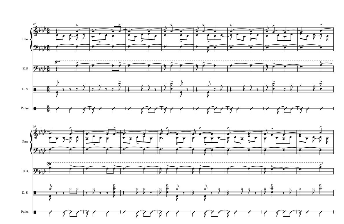I chose to follow a hybrid methodology involving ethnography and analysis to achieve two goals: 1) to incorporate the often-missing voice of expert practitioners into academic discussions of their music, and 2) to present an ecologically valid analysis that connects scholarship with jazz performance practice. While not the explicit purpose of this study, I believe the findings of my ethnographic study contribute to recent scholarship that challenges theoretical and cognitive principles underlying conventional definitions of meter in Western music.35See Clayton (2020), Benadon (2020), Polak et al (2016 and 2020). Meter, defined as an abstract theoretical model, is not always representative of meter as a dynamic cognitive skill employed by listeners and performers. This essay could present evidence to support discussions of context- and genre-specific models of meter, as well as cross-cultural research in music cognition involving experienced improvising musicians. Many of the musicians I interviewed referenced a variety of influences, including Western art music, Brazilian, Balkan, Indian, West African, and popular musics, like metal. While I primarily focused on a theoretical discussion of meter by examining the complex relationship between pulses, timelines, and rhythms as metrically viable entities, future research could explore a historiographic framework that identifies parallels between rhythmic complexity in jazz and other styles.