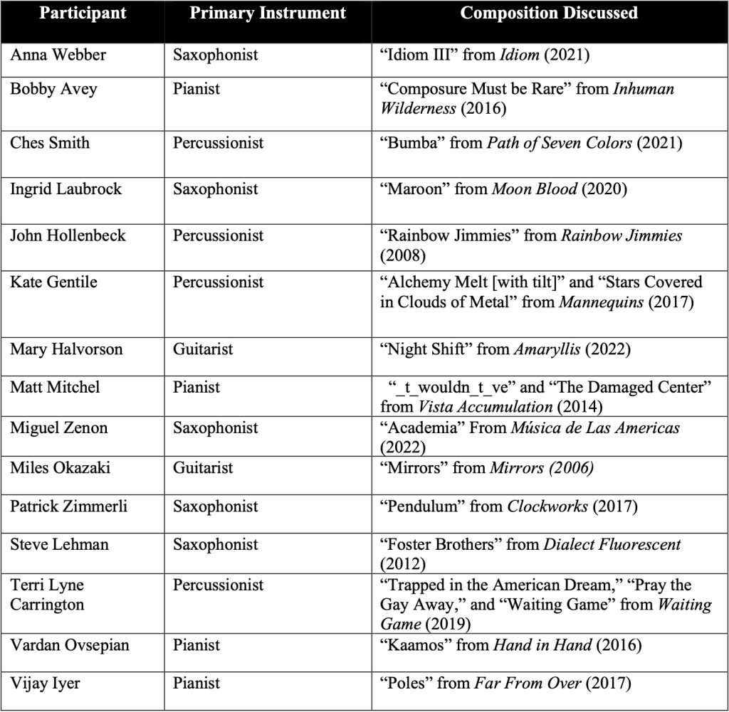 In the fall of 2022, I interviewed 15 professional jazz musicians who have expertise in rhythmically complex contemporary jazz.17I am deeply grateful to the musicians for participating in the ethnographic study; they kindly gave me permission to use the video and interview content as part of this research. While ethnographic work in jazz is not uncommon, studies generally focus on discussions of improvisational practice, substyles, oral histories, and critical theory.18See Berliner (1994), Monson (1996), and Porter (2002). I focused on a discussion of rhythm, and its practice and manifestations in contemporary jazz musicians’ compositions and improvisations. The interviews were part of a study approved by the University of Colorado Boulder Institutional Review Board (IRB protocol: 22-0404). After providing informed consent, the musicians listened to Patrick Zimmerli’s “Pendulum” from Clockworks (2017) without a score and then answered questions about their training and thought processes. I met virtually with each participant using the video conferencing platform Zoom. Interviews lasted about 60 minutes. The participants were not recruited based on a specific type of jazz played but on my subjective determination of their rhythmic capabilities informed by my own experience as a jazz musician. Each participant is an accomplished composer and performer with several albums as a leader and collaborator. All are performing and touring musicians who continue to release new music. To my surprise, some of the most respected people in the field agreed to participate. I spoke with Grammy winners and several McArthur and Guggenheim Fellows.