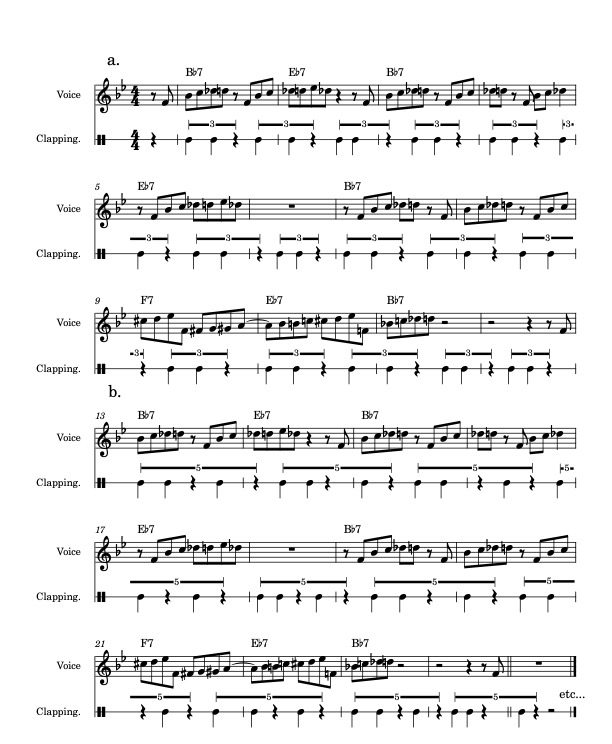 Along with technical and precision-driven rhythmic synchronization, ratios, and metronome work, every musician discussed superimposing (most often non-isochronous) rhythms over standard forms in the jazz repertoire. The meter is almost always duple or triple, and the superimposed rhythms are specifically designed to conflict with the underlying metric frame, thus generating significant metric dissonance. Percussionist Ches Smith described his practice sessions as “displacing things within the context of standard forms […] having these rehearsals for hours just playing on forms.”21Several musicians credit the recordings of Miles Davis, in a particular Live at the Plugged Nickel (1965), as inspiration for exploring rhythmic superimposition in standard forms. Waters (2011) Michaelsen (2019) discuss metric modulation and metric dissonance in the music of Miles Davis’s Second Great Quintet. Miles Okazaki described the training as “can you do this against that?” and demonstrated an increasingly layered process of superimposition involving singing the 12-bar blues “Straight No Chaser” by Thelonious Monk (Media 5). Figure 4 provides a transcription of Okazaki’s demonstration. In the first chorus, Okazaki claps a short-long ternary figure against the duple frame. In the second repetition, the ternary rhythm transforms to a non-isochronous grouping of five. This practice is part of a routine in which he plays three different rhythms simultaneously—one sung, one tapped with his foot, and another clapped.