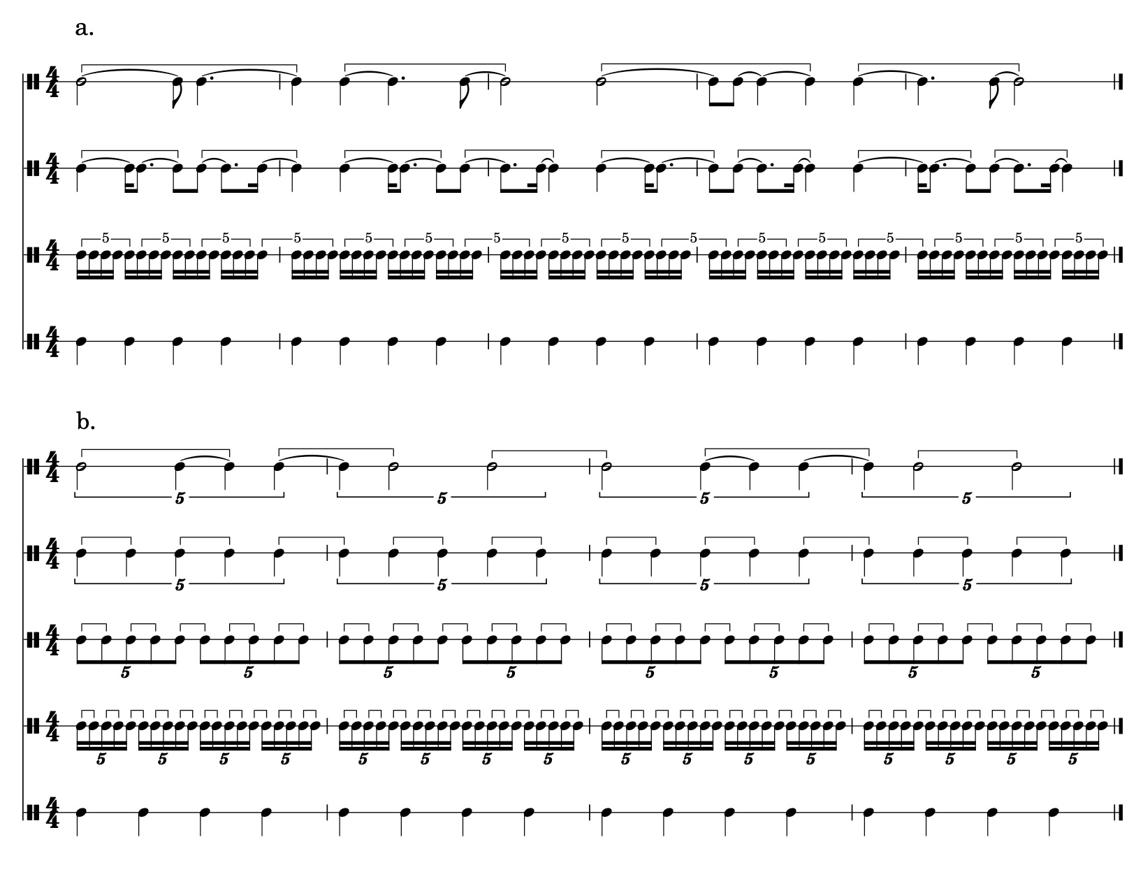 Figure 6a shows the subdivision grouping scheme. The sixteenth-note subdivision is grouped in sets of five, leading to a new pulse that is a sixteenth note longer than that of the underlying 4/4 pulse. This pulse can be grouped with its own constitutive set of hierarchies and subsequently felt as a new quarter note pulse in a 4/4 meter slightly slower than the original (a technique commonly known as metric modulation). Figure 6b illustrates the tuplet grouping scheme. In this case, the sixteenth note is replaced with a quintuplet that is grouped evenly to create a new metric hierarchy. The quintuplet quarter note can then be felt as the pulse in an alternative 4/4 meter slightly faster than the original.22Pulse streams might not be entrainable if the tempo falls outside of the millisecond ranges for beat perception and metricization (London 2012, p. 46). The keen reader will notice this is a different way of arriving at poly-pulse ratio training because the underlying meter sounded against the different quintuple streams creates ratios of 5:1, 5:2, and 5:4 against the underlying meter. Musicians who have devoted significant time training these techniques, such as drummers Dan Weiss and Ari Hoenig, are able to tap into these different pulse streams and meters. Media 7 shows Vardan Ovsepian recounting a story of playing with Weiss using precisely the tuplet grouping approach in Figure 6b to enter an alternative metric state.23Unlike Figure 6, which presents metric modulations that create a co-meter whose tempo is faster, Ovsepian uses the same process to describe a modulation that leads to a slower co-meter.