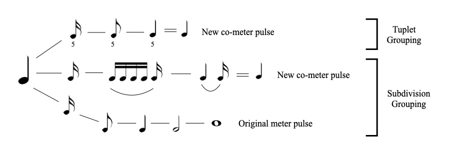 Figure 6: Metric modulation techniques involving tuplet and subdivision grouping schemes for generating co-meters and co-pulses.