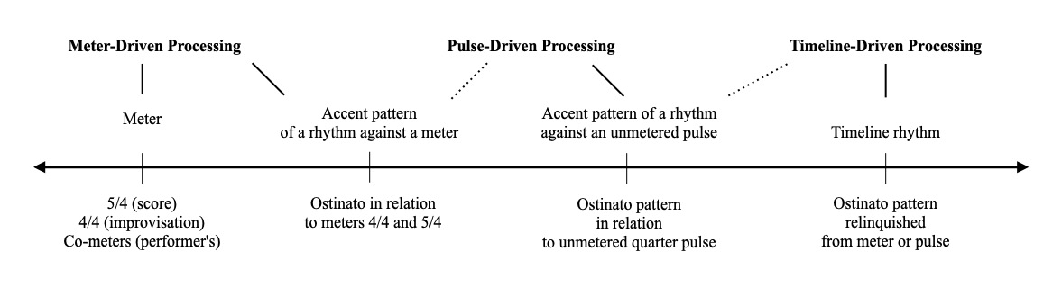 Figure 9 above highlights a possible spectrum of entrainment with four metric states. On the left side are schematic meters. These are metric spaces with beat hierarchies and hypermetric schemes. The 5/4 meter for reading, 4/4 meter for improvisation, and a series of co-meters emergent from a shared initial pulse serve as meter-driven forms of temporal processing. As we continue towards the right, the ostinato’s non-isochronous timeline rhythm (1 + 2 + 2 + 2 and other variants of 2 + 2 + 3) begins to assume more structural responsibility. The second metric state combines meter and timeline into one structural framework. The superimposition of the timeline against the meter generates an accent pattern that can be learned and felt. The entrainment of meter as a series of alternating strong and weak isochronous pulses is transformed into a schematic frame contingent on where the onsets of the ostinato land, on or off the beat, for each measure. Instead of following metric accents, musicians can follow the measures’ unique set of accents that support a meter- or timeline-oriented hearing while still tracking the downbeat of each measure.