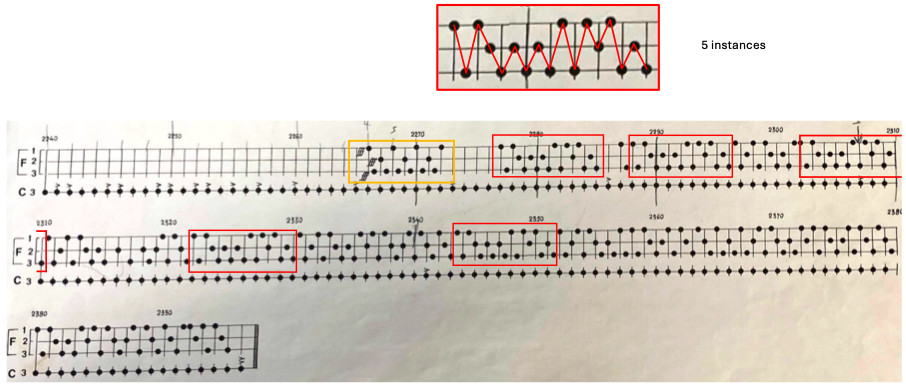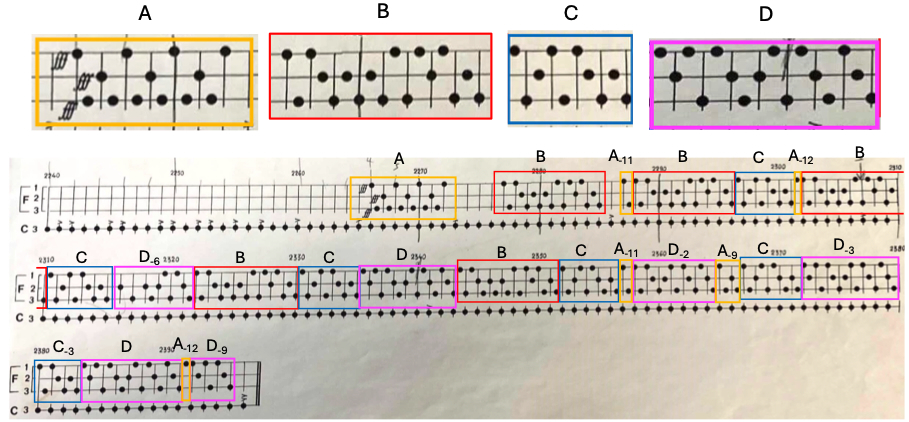 When I first had to learn Psappha, I was (as usual) in a bit of a rush, and as I was reading the score in the early stages of my practice, I had the intuition that I was recognizing patterns, without being able to easily identify them. This set me in motion to apply the paradigmatic approach: beginning with the last section of the score (2266-2395), which does not include any accents, and basing my analytical approach on my performance and analytical experience with Rebonds and Pleiades, as well as following Ruwet’s recommendations, I started looking for the longest possible sequence along the syntagmatic chain (the succession of musical events as they appear in the score) where melodic contour would be repeated. After isolating a sequence that imitated the initial pattern played on instruments A at the beginning of the work (in yellow in Figure 10), I proceeded to the next pattern and identified five identical instances of this second pattern (in red in Figure 10).