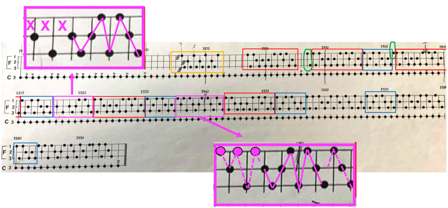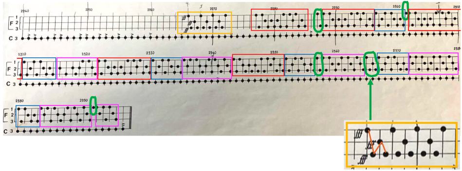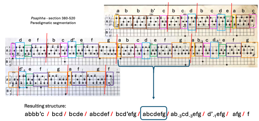Figure 12: Psappha (section 2266-2395). The short series of notes omitted from the main patterns, circled in green, are identified as belonging to the first pattern of this section (framed in yellow).