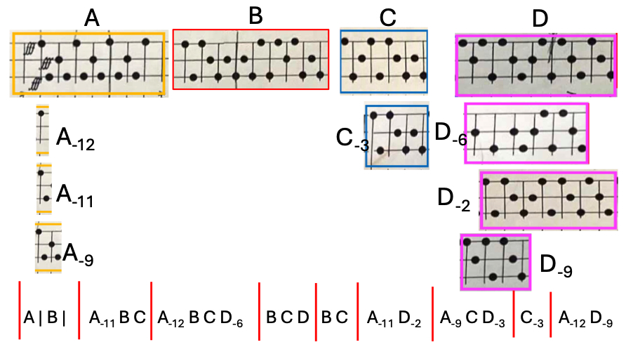 The final segmentation of this section can then be summarized as four main patterns and their variants (Figure 13). C-3 means that this variant presents three fewer notes that the longest pattern of the paradigm, which is identified with the letter C.