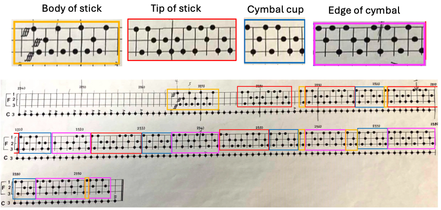 This type of analysis considerably reduces the number of elements to learn, creating relationships between them, and may also be used to underline the inner structure of this final section of the work by modifying the timbre depending on the pattern. Following Xenakis’s recommendation, as mentioned earlier, to highlight the rhythmic structures and architecture of the piece, I decided to use four different types of attack, creating as many timbral variations, to interpret this section. Playing on three cymbals, I chose to use the body of the stick on the main part of the cymbal for pattern A for a powerful and brassy sound, the tip of the stick for more distinct and lighter attacks for pattern B—also played on the main part of the cymbal—strokes on the cup (or bell) of the cymbal for a higher pitched sound for pattern C, and strokes produced with the sticks hitting the edge of the cymbal perpendicularly, for a sound with a noisier but less metallic attack for pattern D (Figure 15 and Media 2).