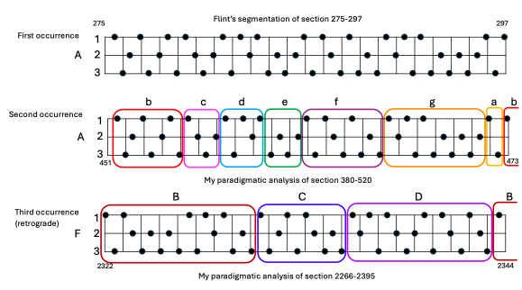 Another interesting point to note is that my paradigmatic analysis of sections 350-518 and 2266-2395 demonstrates that the main pattern, which is presented in full in the middle of each of these sections, is slightly shorter than what Flint identifies (Figure 18); I would argue that the last time unit in section 275-297 and the last two time units in section 2322-2344 (retrograde version) are in fact the repetition of the beginning of the pattern she identifies as being repeated from the first section (275-297). Figure 18 revisits Flint’s segmentation and identification of the same pattern and its retrograde (Figure 9), with my annotations reflecting my own segmentation, as presented in Figures 13 and 16.9It is interesting to note that the presentation of the material in its original version and retrograde lead to two different segmentations.