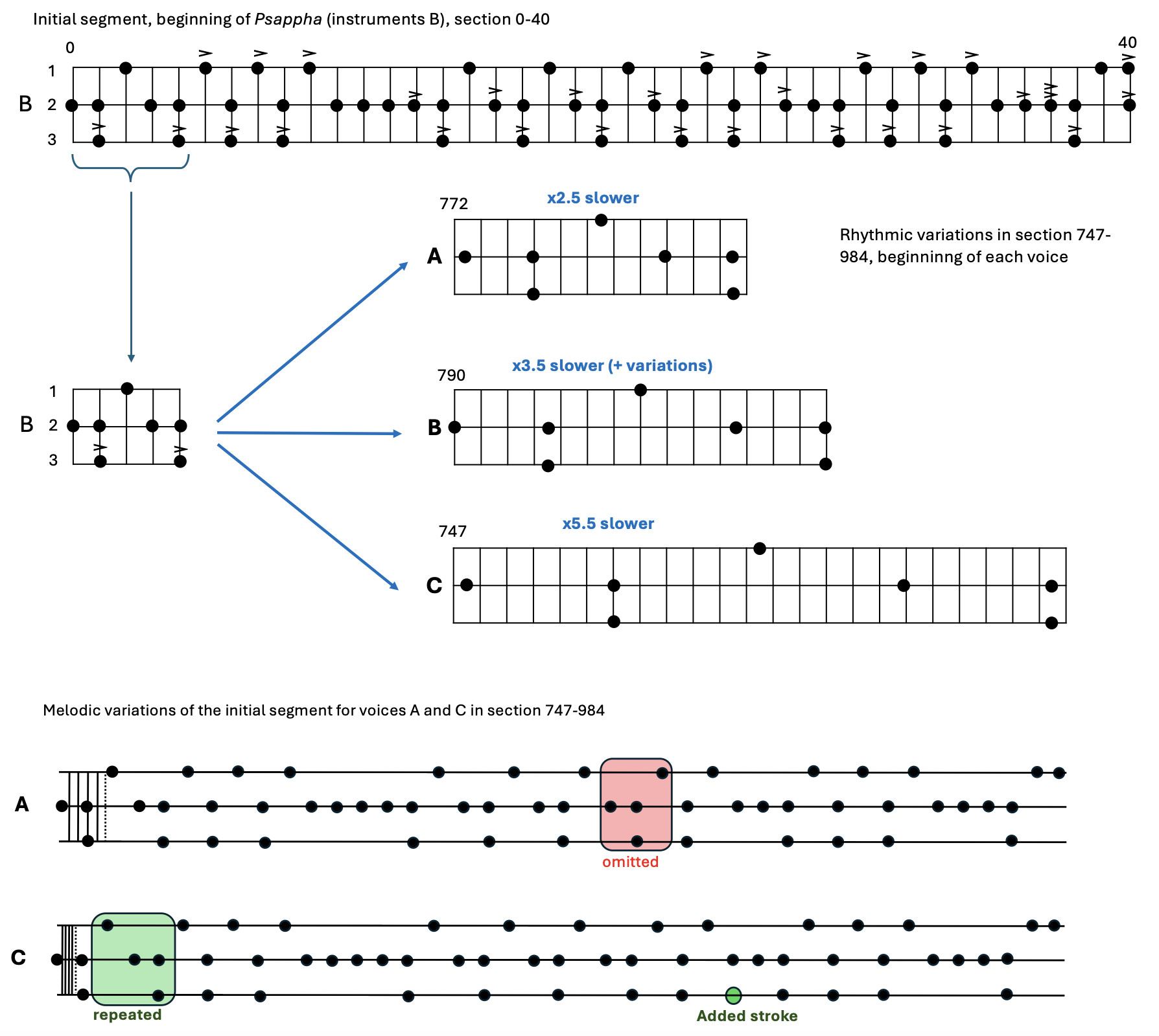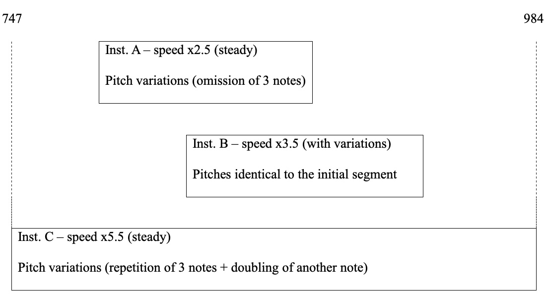 It remains of interest to use this technique to analyze the transformation of some of the musical material through a polyphonic work, especially in sections that use contrapuntal tools such as canon, fugue, etc. In Psappha, this applies to section 747-984, which presents a canon spread over three categories of instruments: A, B and C. Here, Xenakis uses the musical material presented in the introduction of the work on instruments B but at slower timing rates: instruments A are 2.5 times slower than the original presentation, instruments B are 3.5 times slower, and instruments C are 5.5 times slower. However, a comparison term-to-term of each of these voices with the original content (Figure 19) reveals they all present slight differences: pitch variations and the omission of three notes for instruments A; speed variations for instruments B; and pitch variations with the repetition of three notes and the doubling of another one for instruments C.
