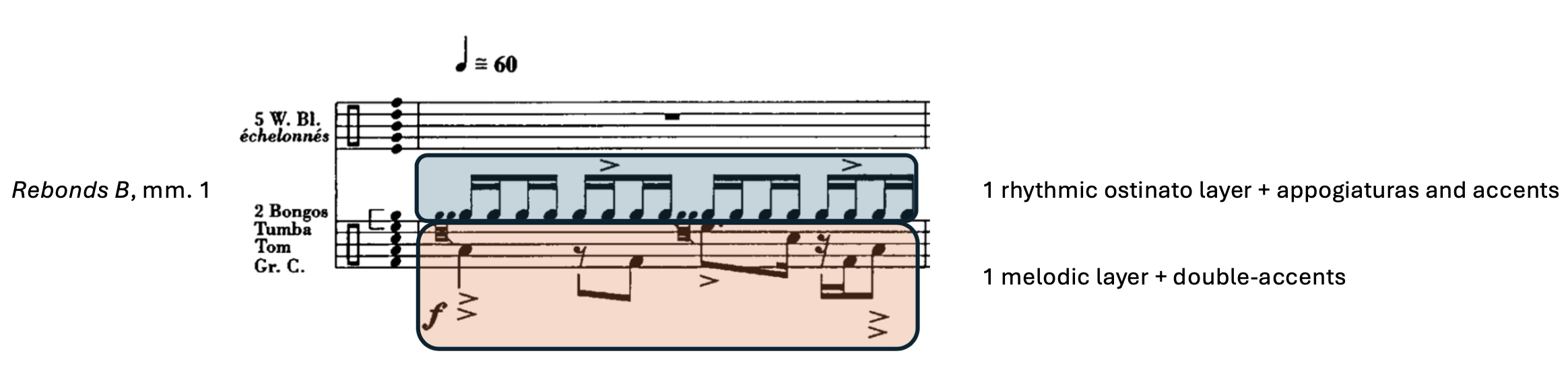 Figure 1: First bar of Rebonds B3Iannis Xenakis, Rebonds A & B, © 1987 Ed. Salabert. with two layers identified as “rhythmic” and “melodic”.