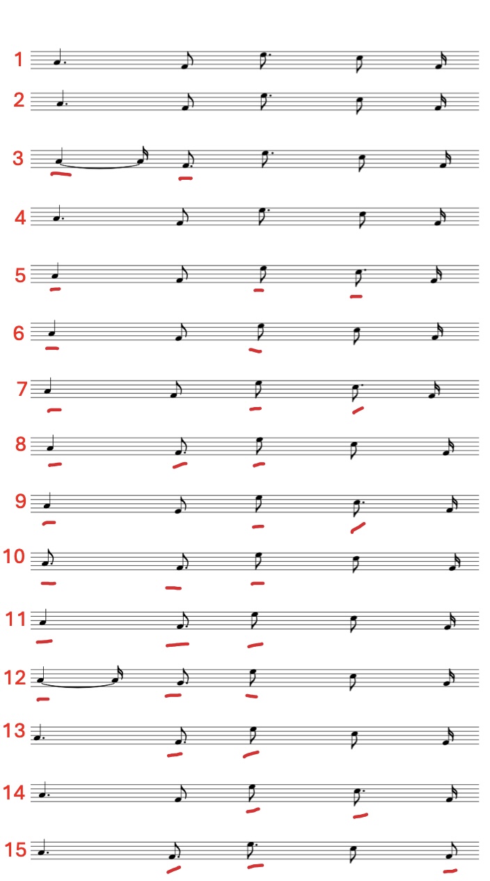 Figure 2b: First 12 bars of Rebonds B. Paradigmatic transcription using rhythmic notation of the 15 first occurrences of the “melodic” cycle, where duration variants are underlined in red.