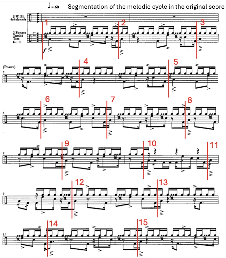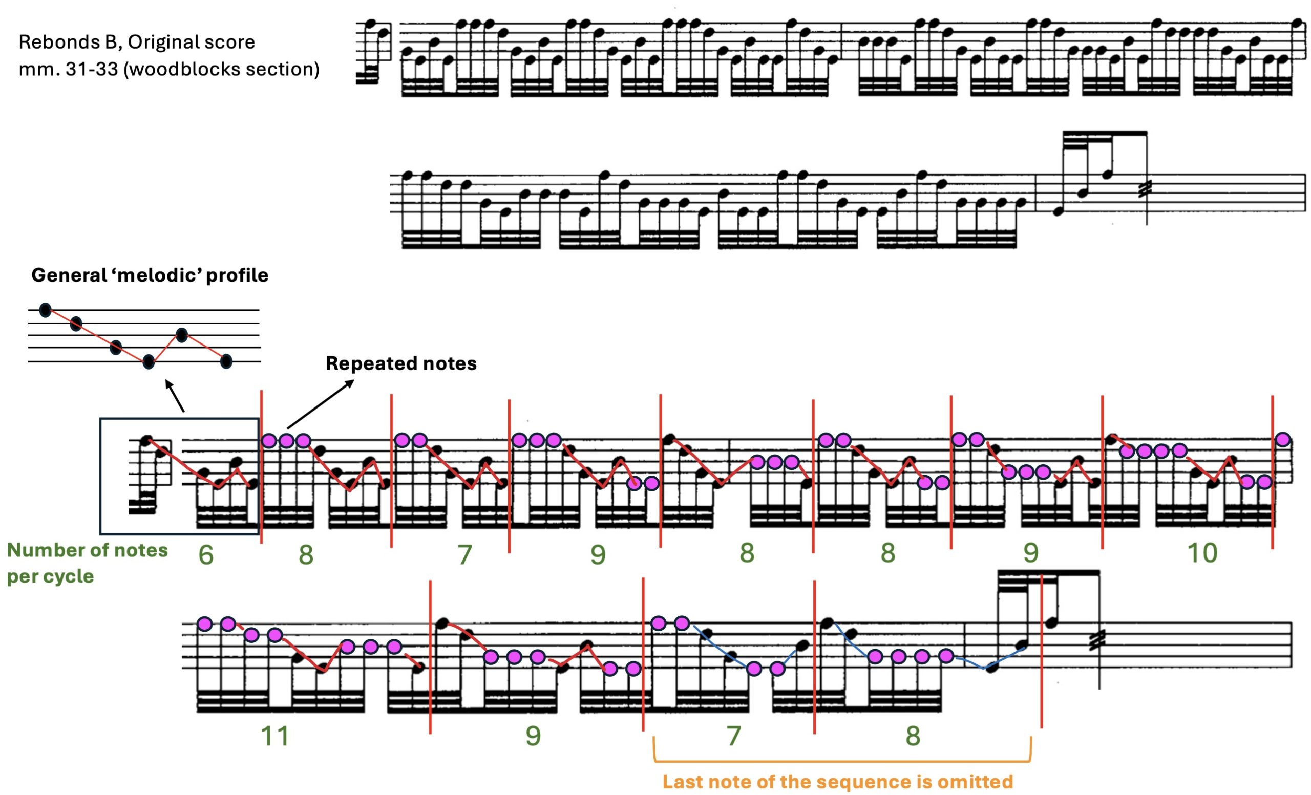 Figure 4: Rebonds B, mm 31-33 (woodblocks), original score and transcription of its segmentation based on a melodic cycle of six notes, whose variants consist of the repetition of certain notes in the cycle; the two last melodic cycles are shortened by one note.