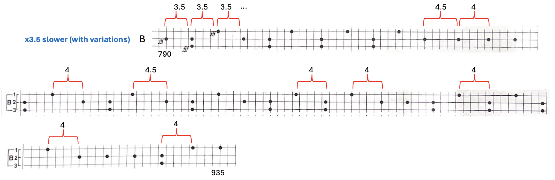 Figure 20: Psappha – Variations of durations for instruments of category B in the canon section (790-935) compared to the initial segment (0-40). Initial section reproduced from 3.5 to 4.5 times slower.