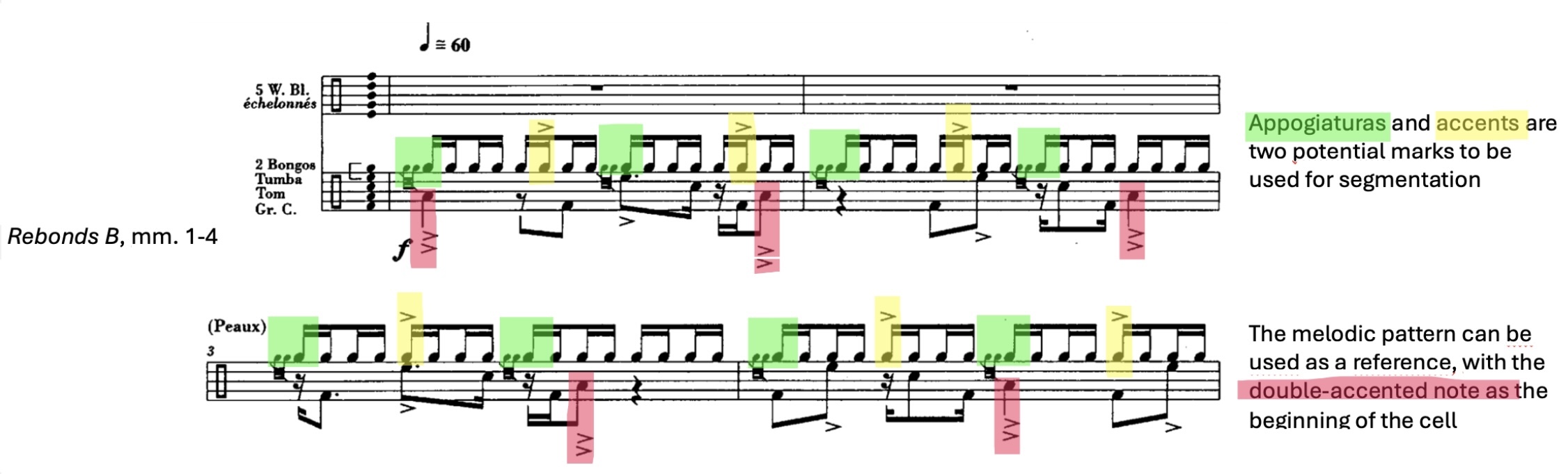 Using this definition of marks and looking back at the first bars of Rebonds B, at least three potential marks can be identified (Figure 3): on the top layer, the appoggiaturas (drags) that can be viewed as timbral change (tone colour) and the single accents, and on the lower layer, the double accents that also correspond to the beginning of the melodic pattern (tone colour/pitch change). My first approach focused on the melodic cycle as primary criterion for segmentation, but it would be possible to proceed to a segmentation that would prioritize another mark, for example the appoggiaturas. In practice, this movement proceeds with three levels of periodicities that are each based on a different mark (appoggiatura, single accent on the top bongo, melodic cycle) that constantly shift in relation to each other.