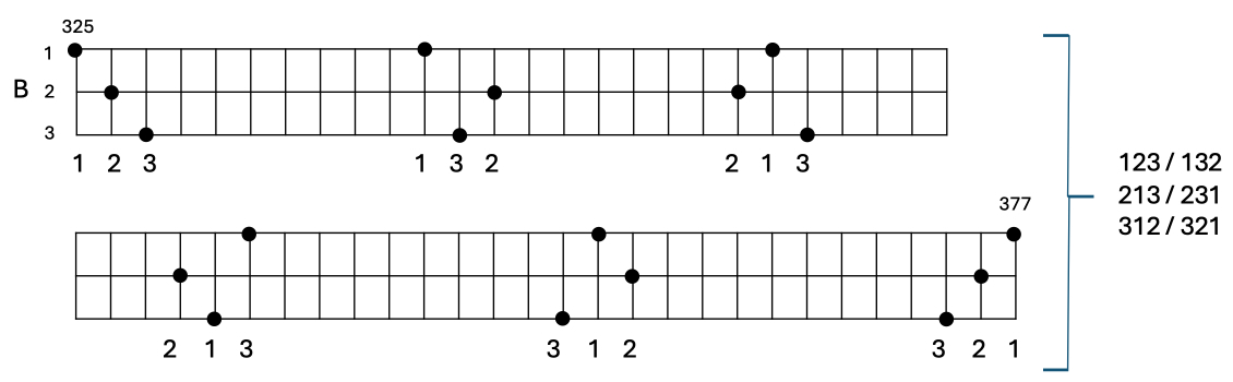 Xenakis uses another process, which is based on the exploration of systematic permutation of pitches within a set group of notes:4See Flint (1993) pp. 277-78 for a detailed explanation, and Gibson (2011) pp. 115-134 about group structures in general in Xenakis music. this is the opposite of the phenomenon described earlier, since the rhythmic grouping remains steady while the pitches are commuted. A first example can be found in its simplest form in Psappha (section 325-377) where the composer exposes the six possible permutations obtained with three pitches and three consecutive sounds (Figure 5).