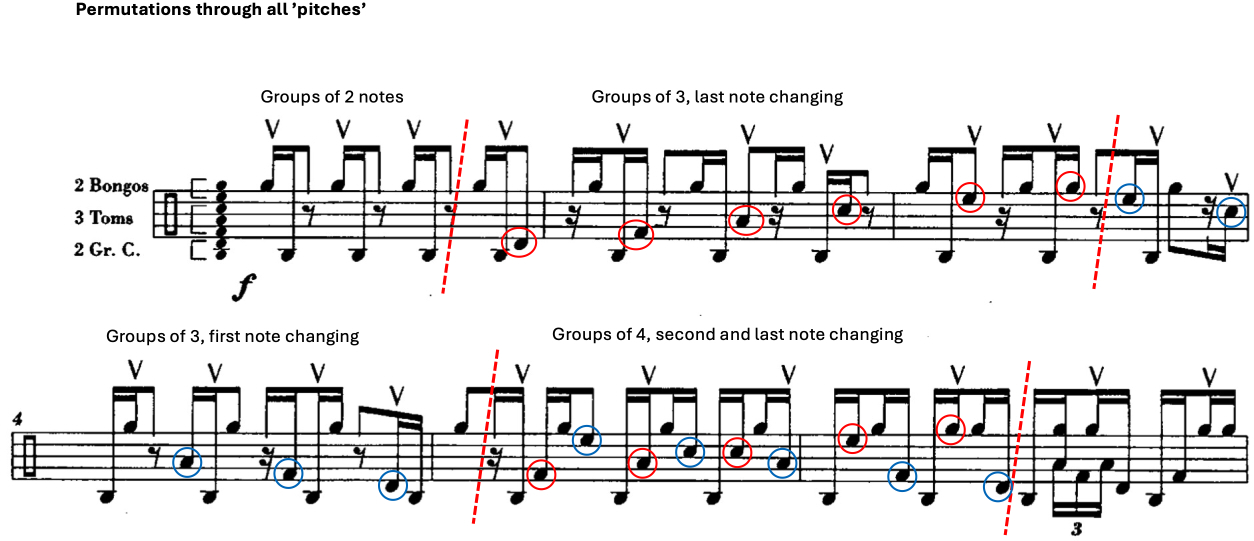 This basic melodic material will be varied throughout the movement and can be traced up almost to the end of the movement, that finishes as it began, using only the two drums at the extreme ranges of the register. In the section preceding the end of the work, which consists of a gradual densification of rhythm and polyrhythms, we can identify the same permutation process where a ‘melodic’ motif based on four notes at the outset develops to a motif of six notes, progressively permuting pitches. The segmentation of the following example (Figure 7) in a two-part pattern is based on Ben Duinker’s analysis (Duinker 2021) that juxtaposes a short melodic motif characterized by an overall ascending contour and starting with a double-accented note, with groups that present increased rhythmic density and polyrhythms. Pitches that are modified from one occurrence to the next are circled in red (Figure 7), while the colour code helps to identify motifs that present identical melodic contours.