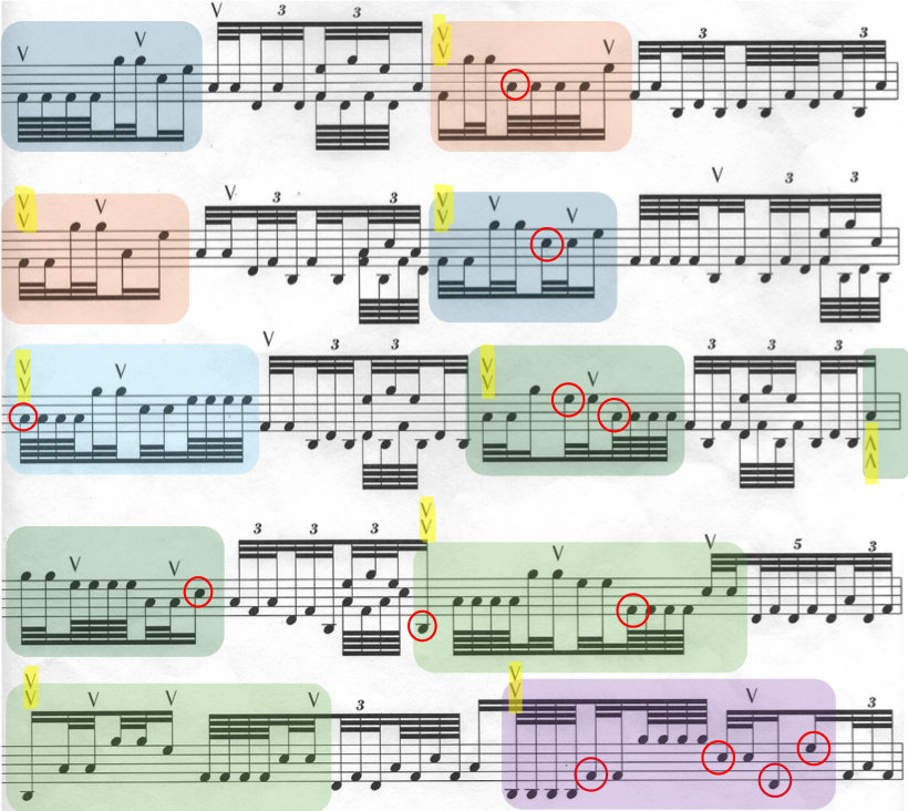 Being able to identify this kind of structure is extremely helpful, since delineating a segmentation in which inherent logic is based on the structure of the piece fast-forwards the learning process: confronted with what seems a quasi-random pattern, performers tend to default to metric subdivisions to segment such a passage into smaller units that can be more easily rehearsed and assimilated. Once recurrences are identified, the new grouping allows the performer to focus mostly on what differs from one group to the next, while providing a unifying framework, facilitating the learning process in two ways. The segmentation based on the paradigmatic analysis also offers new insights regarding the interpretation of the piece, offering potential phrasing possibilities.