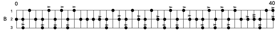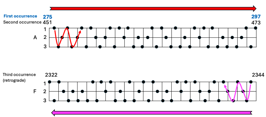 Figure 9: Identification by Flint of a pattern within a long sequence presented in full in three different parts in the work (sections 275-297 and 451-473 on instruments of category A, and 2322-2344 on instruments of category F), the last one being presented in retrograde. Only the melodic contour has been kept in this transcription.