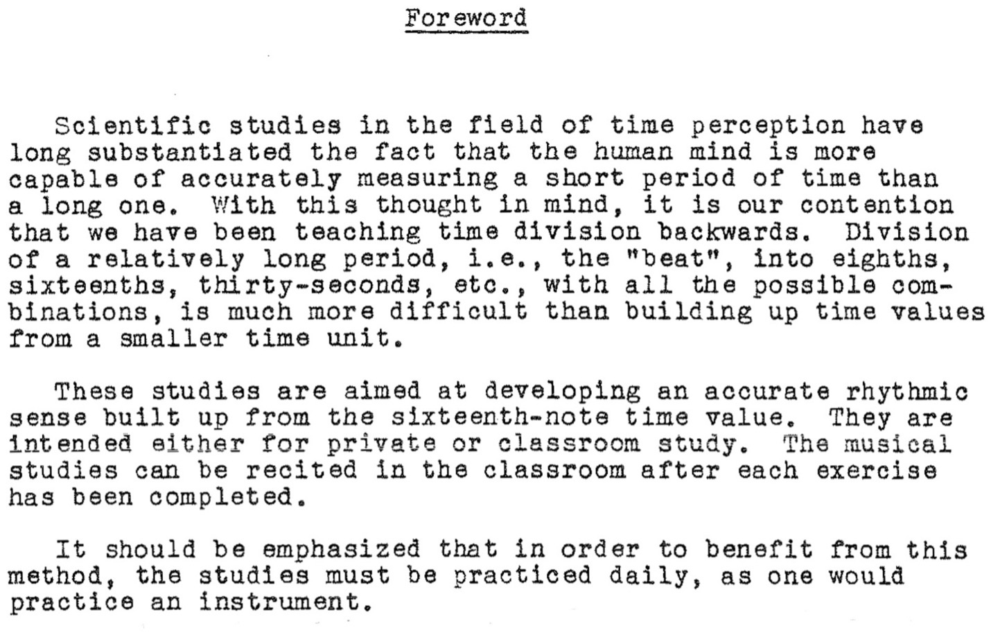 The possible combinations are endless, and the aim in this method has been to include the basic patterns only. It is hoped that with these fundamentals the students will be able to analyze and correctly interpret the more complicated patterns […] It is hoped that the student will apply this type of counting in his other musical activity until accurate time spacing becomes second nature. (Teal p. 24)