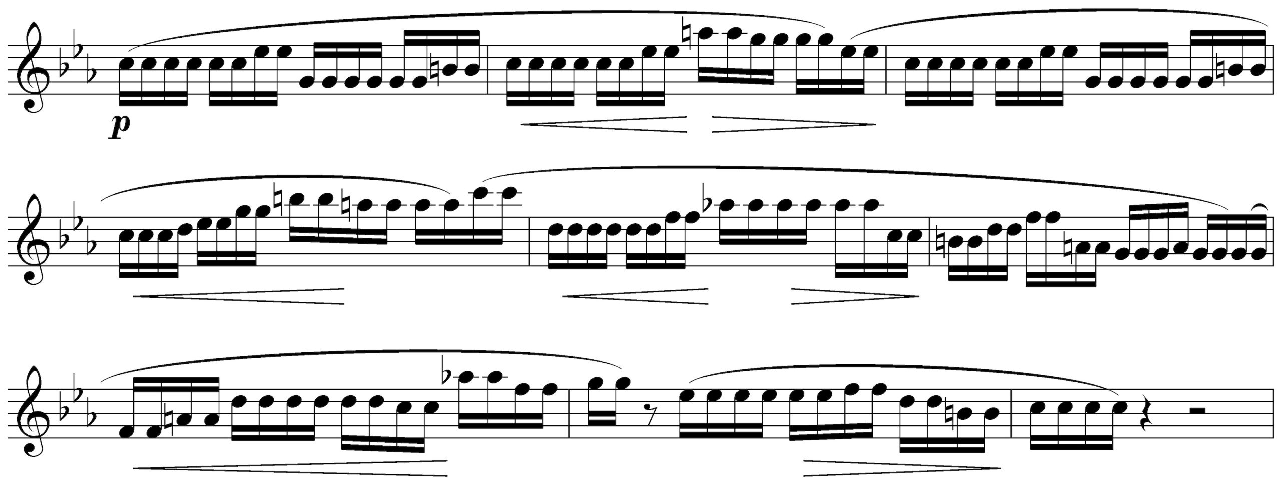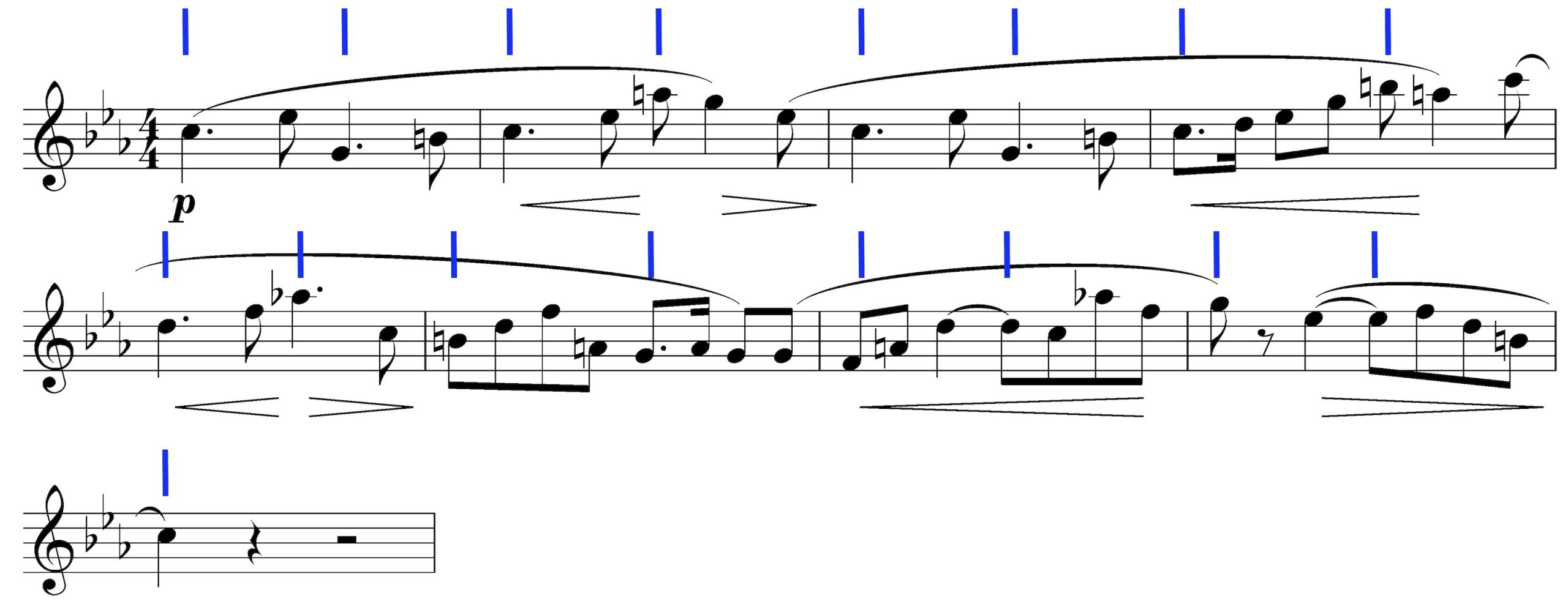 To be as fair as possible during these demonstrations, I did not practice performing the excerpt with the three kinds of RSE. I recorded the videos quickly in my work studio, and the videos are raw and unedited. My goal was to display very frankly any differences we might be able to perceive by my playing the excerpt with the three different kinds of RSE. When I viewed the videos afterward, I was surprised to see how different my body use was in the three videos: very little physical movement while using RSE with half notes, distinctly more movement while using RSE with eighth notes, and even livelier movement while entraining with sixteenth notes. I had been unaware of those differences in my physical movements while I recorded the three versions. As I performed the excerpt using RSE with half notes, I felt unengaged and unable to play with the nuance and expression I normally would, despite doing my best to do so. When I performed the excerpt using RSE with the eighth-note pulse, I felt distinctly more engaged, but still limited in terms of having the freedom and ability to play musically. Only when I performed the excerpt using RSE with the 16th notes did I feel fully engaged and able to play more freely and musically.